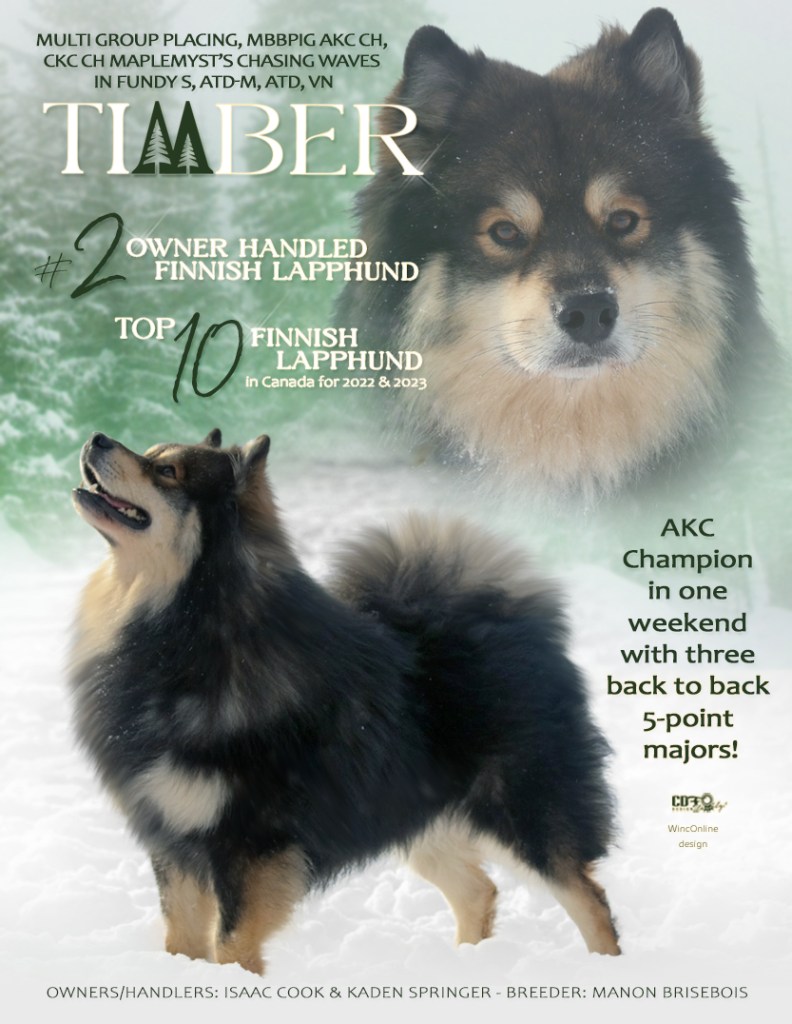 2024 – #9 All-breed and #3 Owner-Handled in Canada. Timber earned an invitation to the 2024 NOHS Finals at the National Dog Show in Orlando, Florida as the #10 Owner-Handled Finnish Lapphund in the USA. He was also the only Canadian Finnish Lapphund in the top 20 OH ranking.